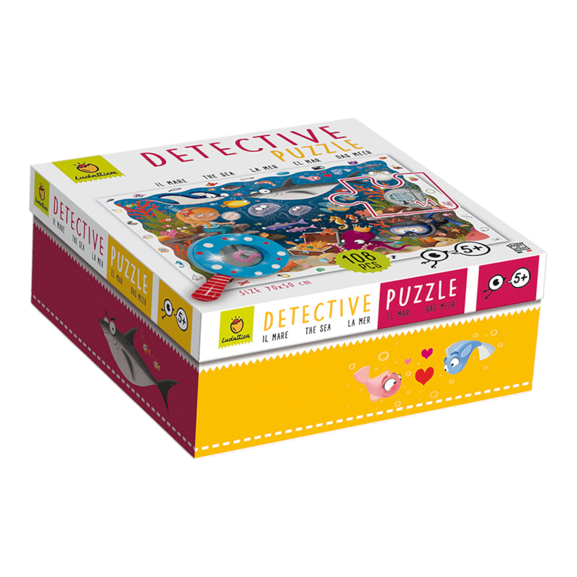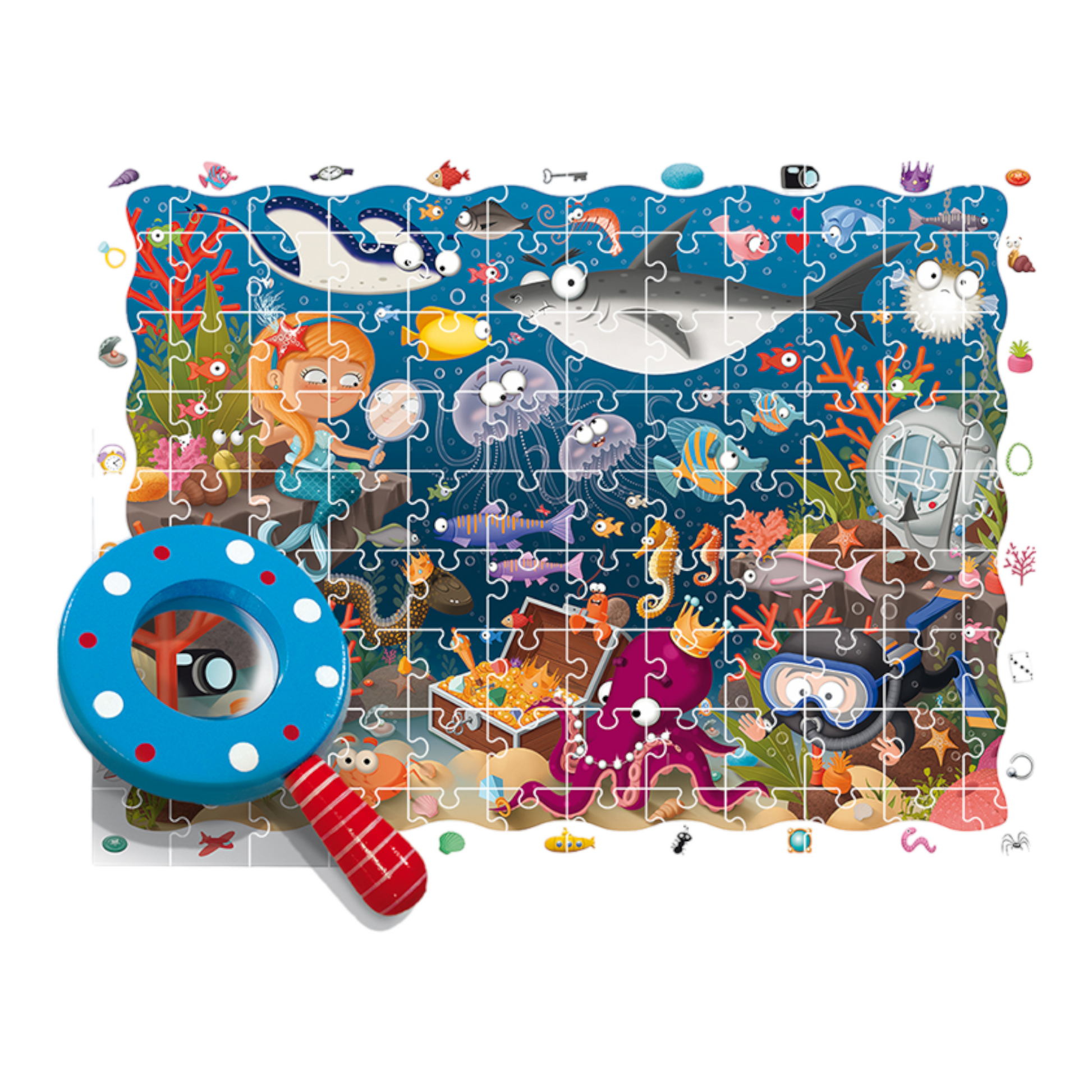 Ένα παζλ εξαιρετικής ποιότητας 108 κομματιών με θέμα τη θάλασσα. Συνθέστε το παζλ και γίνετε ένας μικρός ντετέκτιβ, χρησιμοποιώντας τον ξύλινο μεγεθυντικό φακό, για να ανακαλύψετε τα διάφορα αντικείμενα που φαίνονται γύρω από την εικόνα. Ένα ιδιαίτερο παιχνίδι που εξάπτει την περιέργεια των παιδιών και παράλληλα αναπτύσσει την παρατηρητικότητα τους.