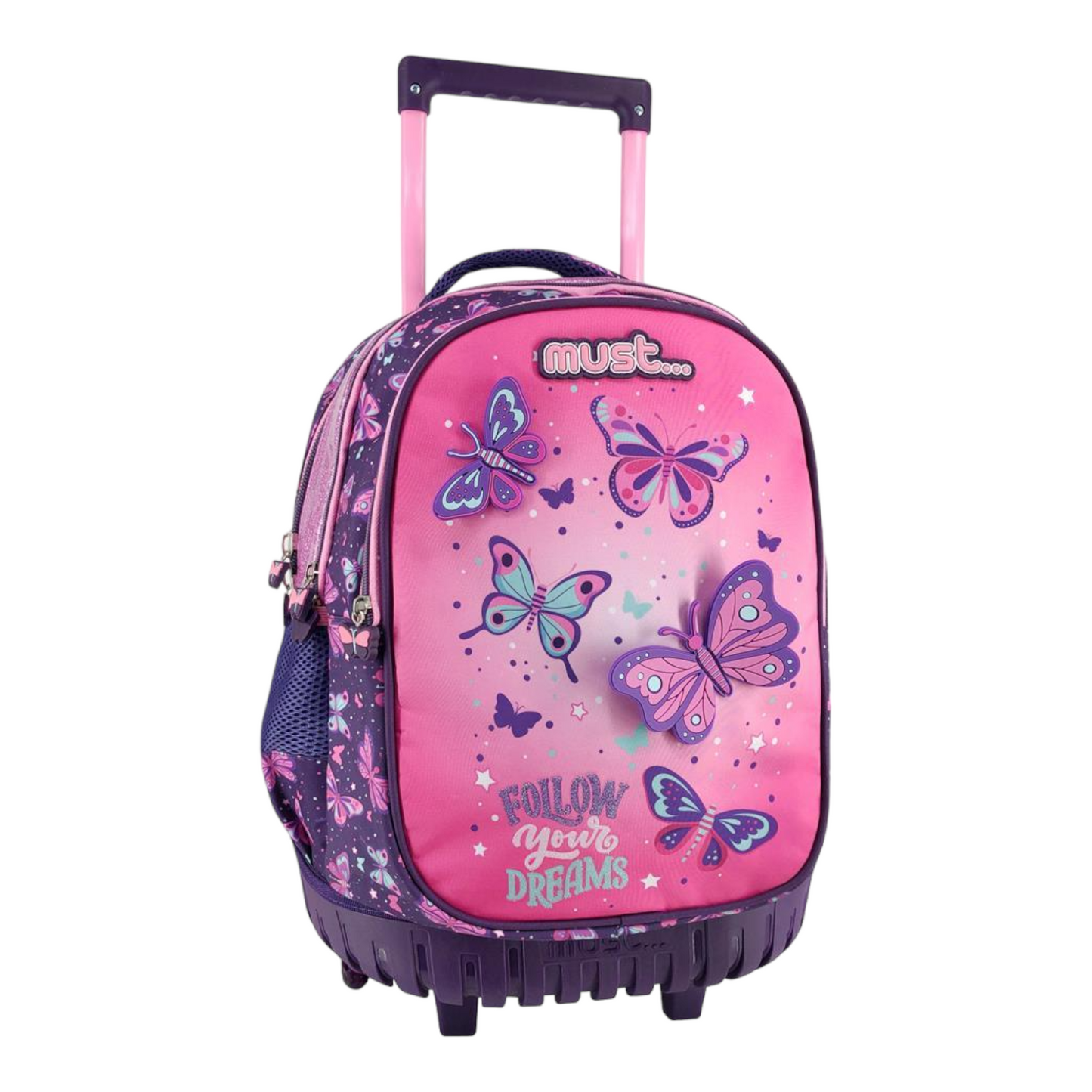 Σχολική Τσάντα Τρόλεϋ Δημοτικού Must Follow Your Dreams με 3 θήκες με υπέροχο σχέδιο πολύχρωμες πεταλούδες από καουτσούκ!